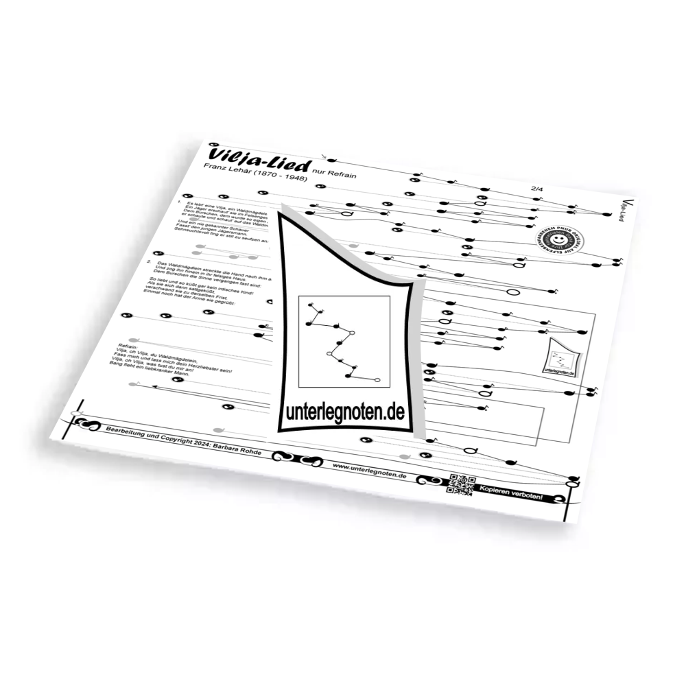 Unsere Noten sind alle zweistimmig bearbeitet (mit Ausnahme mancher Kanons und wenn es explizit vermerkt ist). Spielen Sie mit der rechten Hand die Melodie, während Sie mit der linken Hand eine harmonisch dazu passende Begleitstimme spielen.
